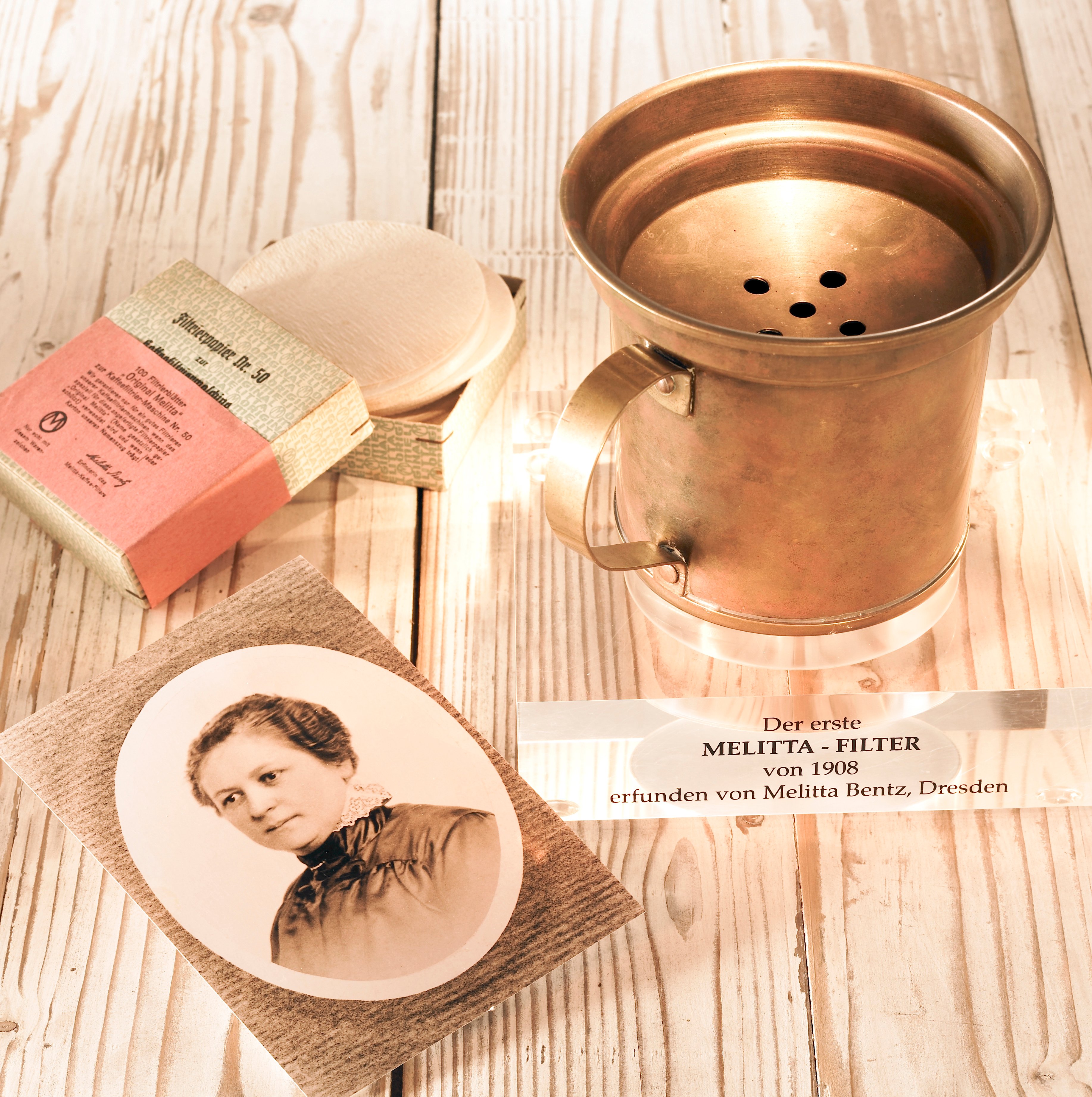 Melitta Bentz, eine Hausfrau aus Dresden, kocht wie jeden Tag Kaffee. Trotz ihrer Liebe zum Kaffee stört Melitta Bentz der Satz in der Tasse und der dadurch ausgelöste, sehr bittere Geschmack. Sie sucht nach Möglichkeiten, dies zu verändern. So kommt ihr die Idee für einen Filter aus Papier. Sie probiert es aus und schlägt Löcher in den Boden eines Messingbechers. Jetzt fehlt nur noch das Filterpapier. Kurzerhand nimmt Melitta Bentz ein Blatt Löschpapier aus dem Schulheft ihres Sohnes und legt es in den Becher – der „Original-Filter“ ist geboren. Am 20. Juni 1908 lässt sich Melitta Bentz ihren Filter als Gebrauchsmuster schützen. Die Erfindung wird zur Geschäftsidee und das junge Unternehmen nach der Erfinderin Melitta Bentz benannt. Anfangs gibt es kaum mehr als den Namen und die Idee. Das Startkapital der Familie beträgt 72 Reichspfennige; ein Zimmer in ihrer Wohnung dient als Firmensitz. Noch ahnt niemand, dass Melitta mit ihrer Idee den Grundstein für einen internationalen Konzern legt.